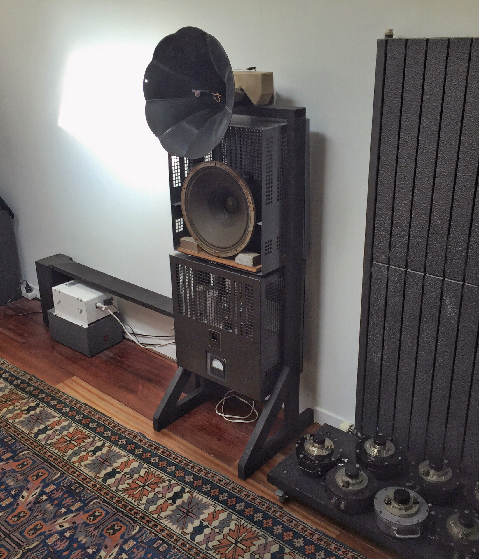 imageA little office system. Smaller that the we16a that used to sit there! We4151 driven by we86, Boyer compression driver connected to old western electric microphone horn. I may arrange that the red light at mouth of horn lights up when the system is on…sound good and easy even and just so smooth.