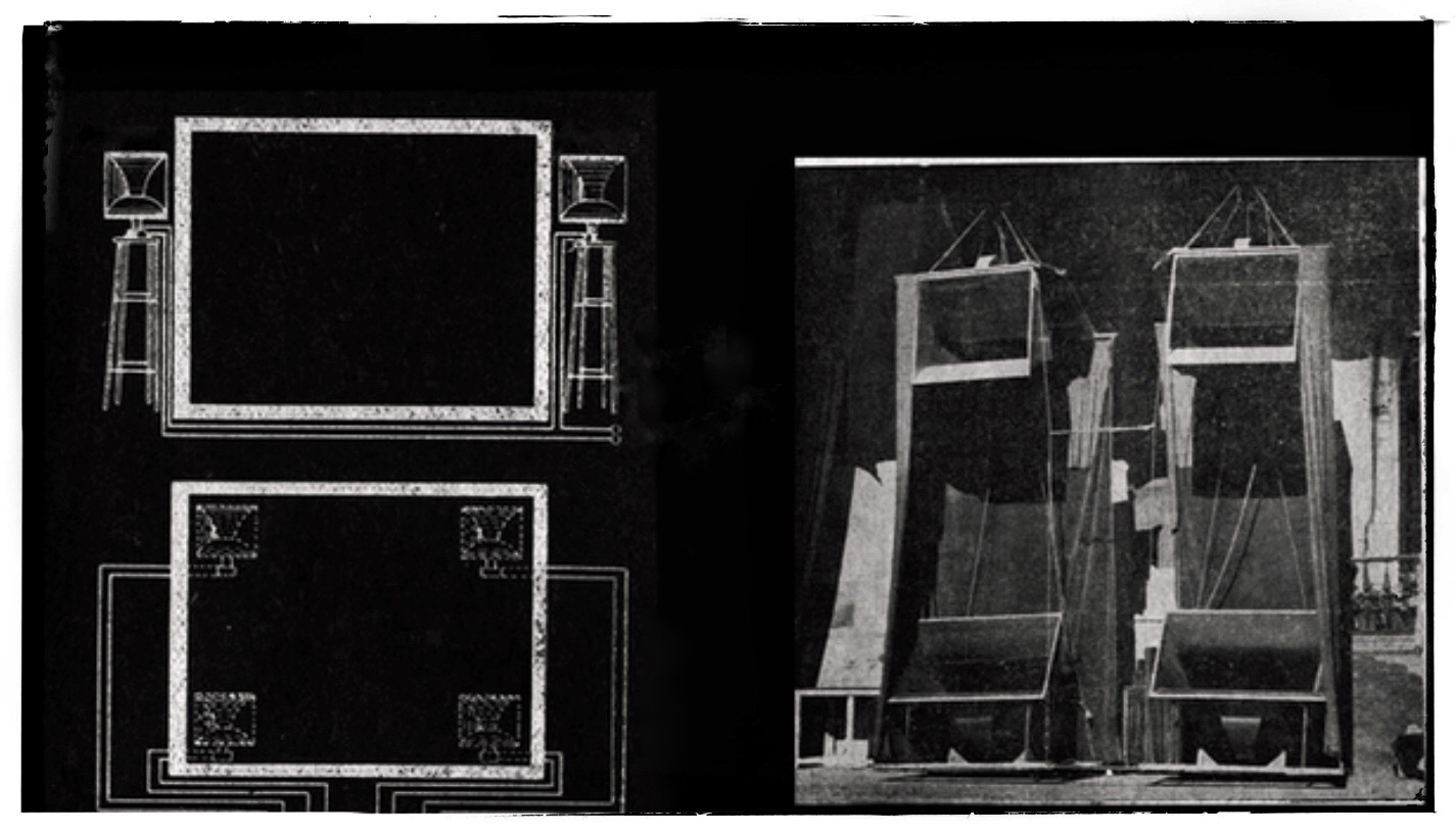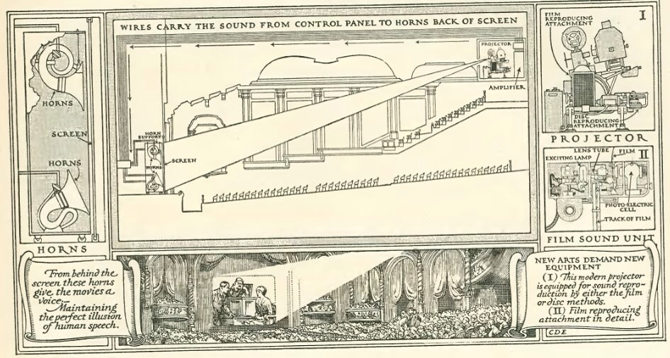 As we know the 1st sound installations for talkies were designed to be rolled onto the stage of theatres. They were rolled out when it was “movie night” ! Then rolled back in….this carried on until dedicated theaters were installed as talkies literally took over the “scene”. Just imagine this huge construction with all wires hanging off etc….this is without doubt a rare image of a western electric 12a and 13a installation very early indeed, 1926? Also image taken before the advent of sound transparent screens. The screen is above the horns, you can notice how the 12a’s are pointing upwards to get the sound to the balcony audience. It’s not evident why there is drappimg around this tower of horns, perhaps to keep them out of sight when not in use?